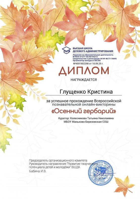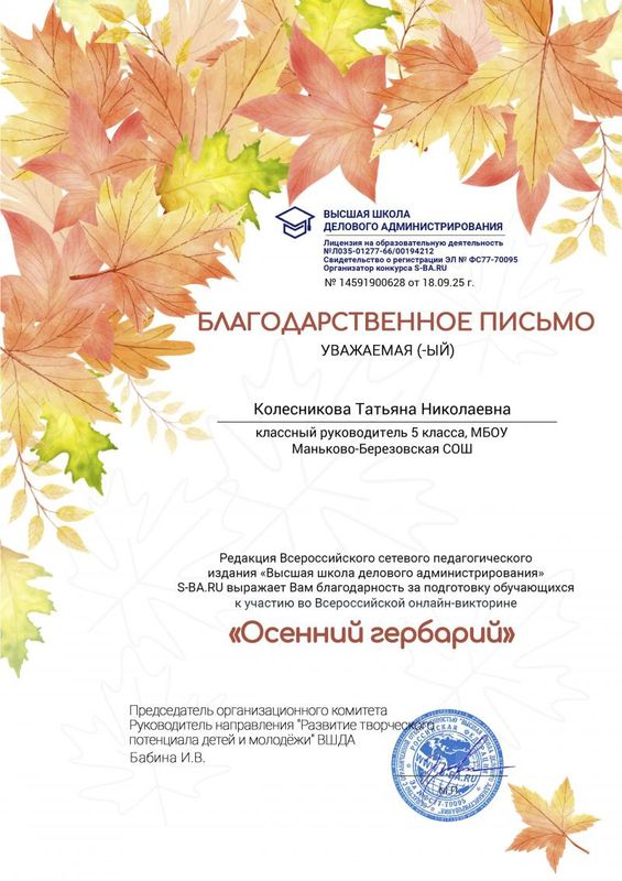 Обучающиеся 5 класса МБОУ Маньково-Березовской СОШ приняли участие во Всероссийской познавательной онлайн-викторине "Осенний гербарий" и отмечены дипломами. Руководитель - Колесникова Татьяна Николаевна.