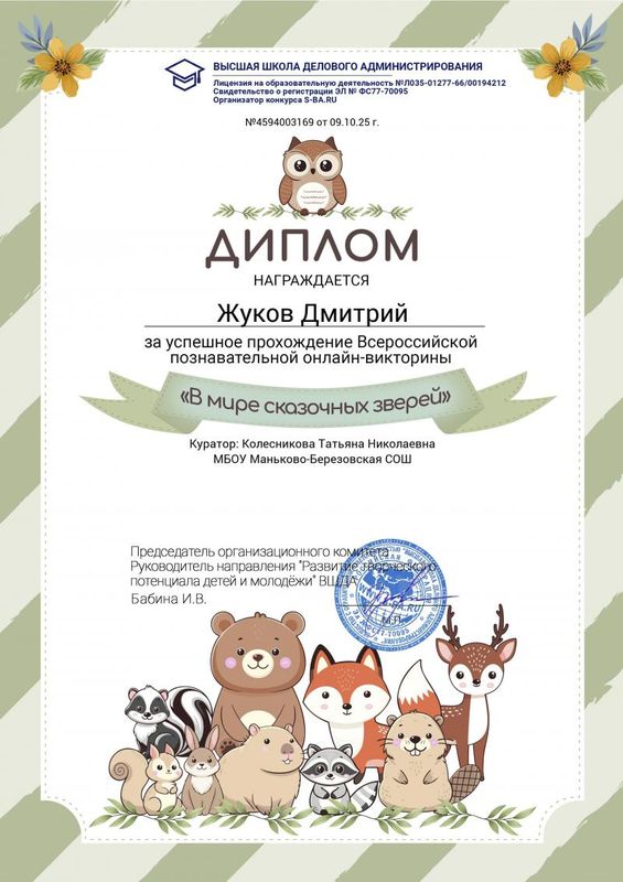 Жукова Анастасия и Жуков Дмитрий приняли участие во Всероссийской познавательной онлайн-викторине "В мире сказочных зверей" и отмечены дипломами. Руководитель - Колесникова Т.Н.